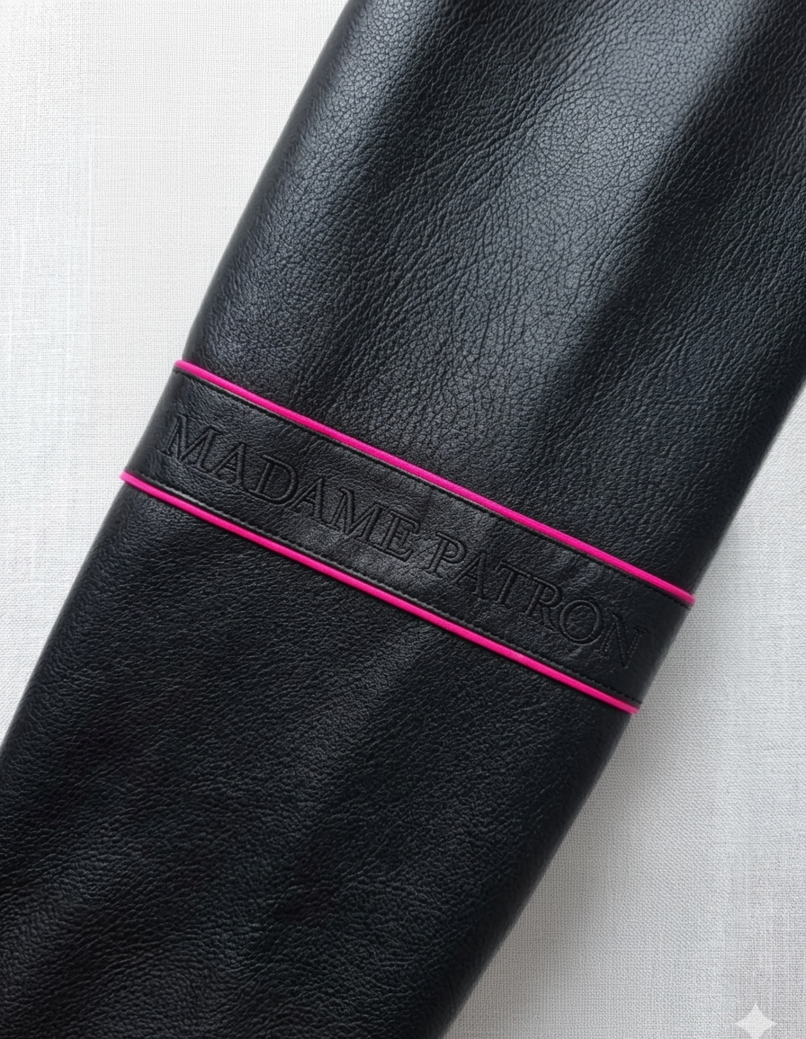 - Black stitched Madame Patron branding on the sleeve strap