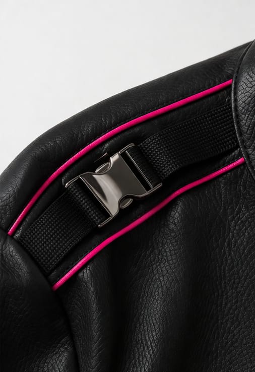 - Black faux leather with pink contrast piping